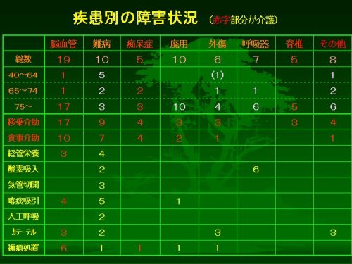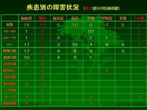もういちど同じ表を見ていただきますと、表の赤字の部分、脳血管障害のかたの場合が典型的です。高齢で、ほとんどのかたが移乗介助や食事介助だけという状態です。痴呆症も進行して重度になりますと、生活上の介助が必要になってきます。
