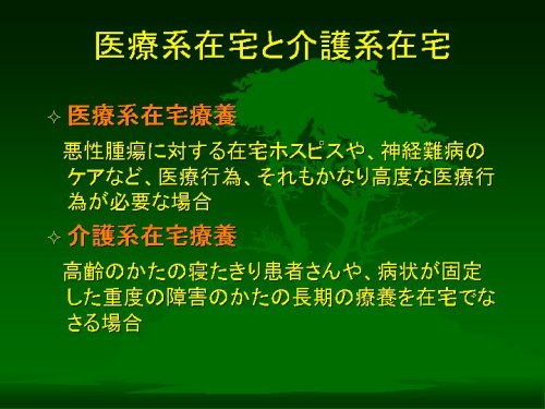 在宅ケアの話をするときに、医療系と介護系をごっちゃにしますと、議論が噛み合わなくなってきたり、間違った結論に向かってしまいます。これは、介護保険になって、いわゆるケアプランをたてるときにもじゅうぶんな注意が必要な点です。