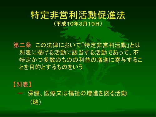 ご存じのように、平成10年3月19日に「特定非営利活動促進法」いわゆるNPO法が成立しました。この法律の第二条に「特定非営利活動」が規定されていますが、活動の最初に「保健、医療又は福祉の増進を図る活動」があげられています。
