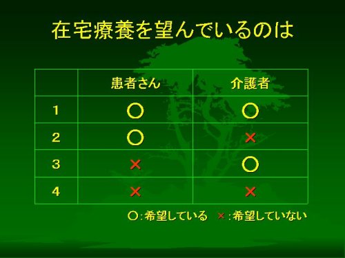 3についてはある意味ではちょっと問題があります。患者さんご本人の意思に反してご家族が家でみたいとおっしゃるわけで、こういうケースのなかには遺産相続を巡っての家族間の確執や嫁姑小姑のゴタゴタなどが関係していることを私は少なからず経験しており、そういうゴダゴタに在宅チームが巻き込まれないよう注意が必要な場合があります。在宅医療・福祉というのは、ご家庭の中ある程度入り込んでいかざるをえませんので、いかに線をきちっと引いておくか、これはけっこう大切な問題であります。もっとも、いわゆる植物状態や高度の痴呆のある場合にはご本人の意思の確認というものは不可能であり、この場合は現実にはご家族の意向を尊重するしかないでしょう。