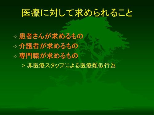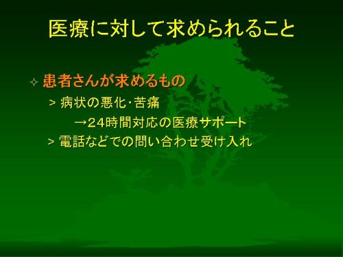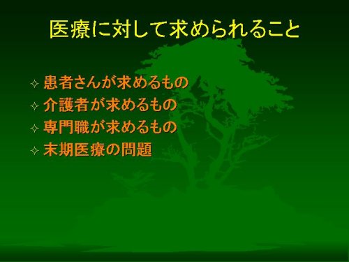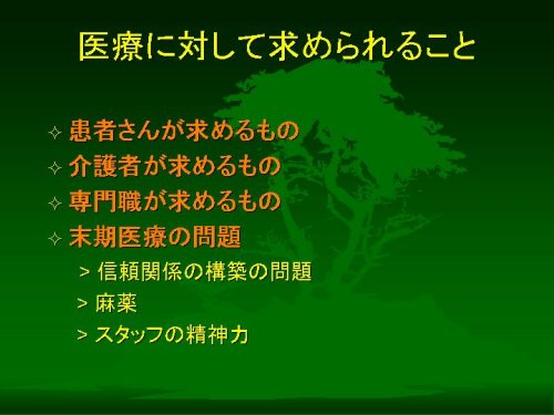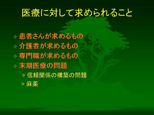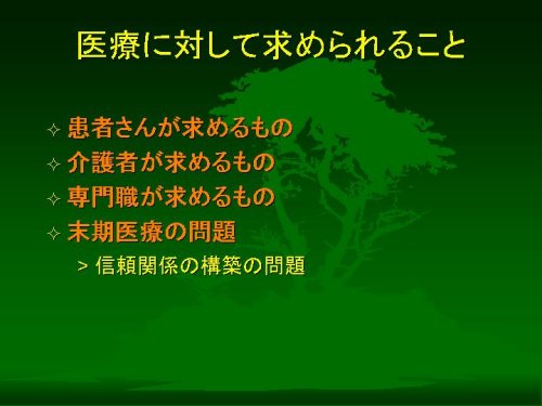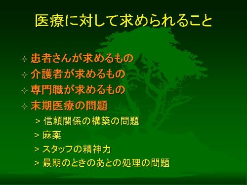 このように、医療に対して「患者さんから」「介護者のかたから」「専門職から」求められるものがあるはずです。そしてその3者すべてが医療に求める特殊な場面として、いわゆる「末期医療」があると考えられます。