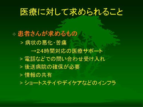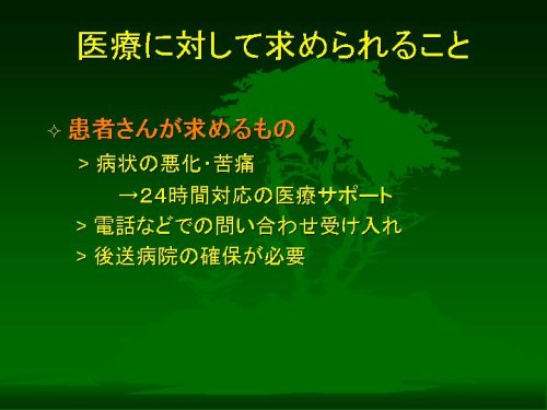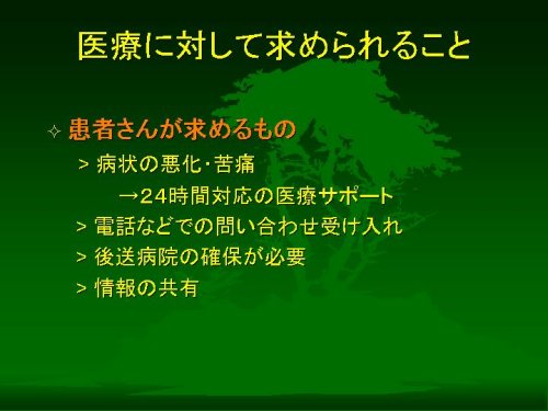 システムとしての理想は、複数の救急医療機関に在宅患者さんのある程度の情報を持っておいていただいて、必要なときには主治医の電話一本程度で継続した治療をしてもらえるというものでしょうが、しかしこれは実際にはなかなか難しいかもしれません。つまり、病院、とくにそこで勤務する医師は、在宅療養の主要な供給元であるにもかかわらず、在宅療養そのものに関心が薄く、無理解であることが多いのが実情だという印象を私は持っています。