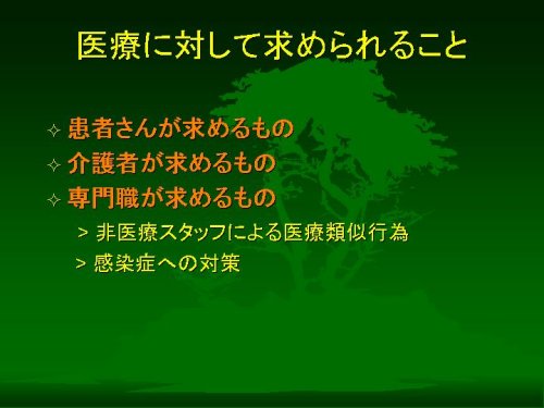 まず最初に考えられるのは、非医療スタッフ、つまりホームヘルパーや福祉施設での介護職員にとっての医療類似行為の問題です。たとえば喀痰の吸引や経管栄養、簡単な他動運動など、医療側からみれば危険はないので実行してほしいようなことがしていただけないということ。これをしていただけないと、前に述べましたご家族に自由時間を作っていただくというバックアップがほとんどできなくなってしまいます。また、聞き及ぶところでは、多くのショートステイについても医療類似行為が必要なかたの対応をしていただけないらしい。老人保健施設には、たとえば経管栄養であることを理由に入所を拒んではいけないという通達がありますが、通達があるということは入所拒むことが目立つからでありましょう。情けないことです。