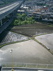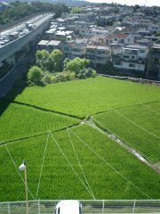 おおむち診療所のあるビルの南側にある、造成宅地と県道バイパスに囲まれた三角形の農地にある田圃。ビル4階、トイレの前の窓から見下ろす田圃の2004年5月からの一年。 |