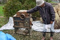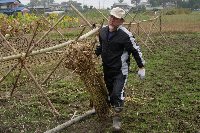 | 鎌で鼻の部分だけ収穫 | コンテナに詰めて運搬 | 乾燥施設の中に並べます | お疲れ様でした |