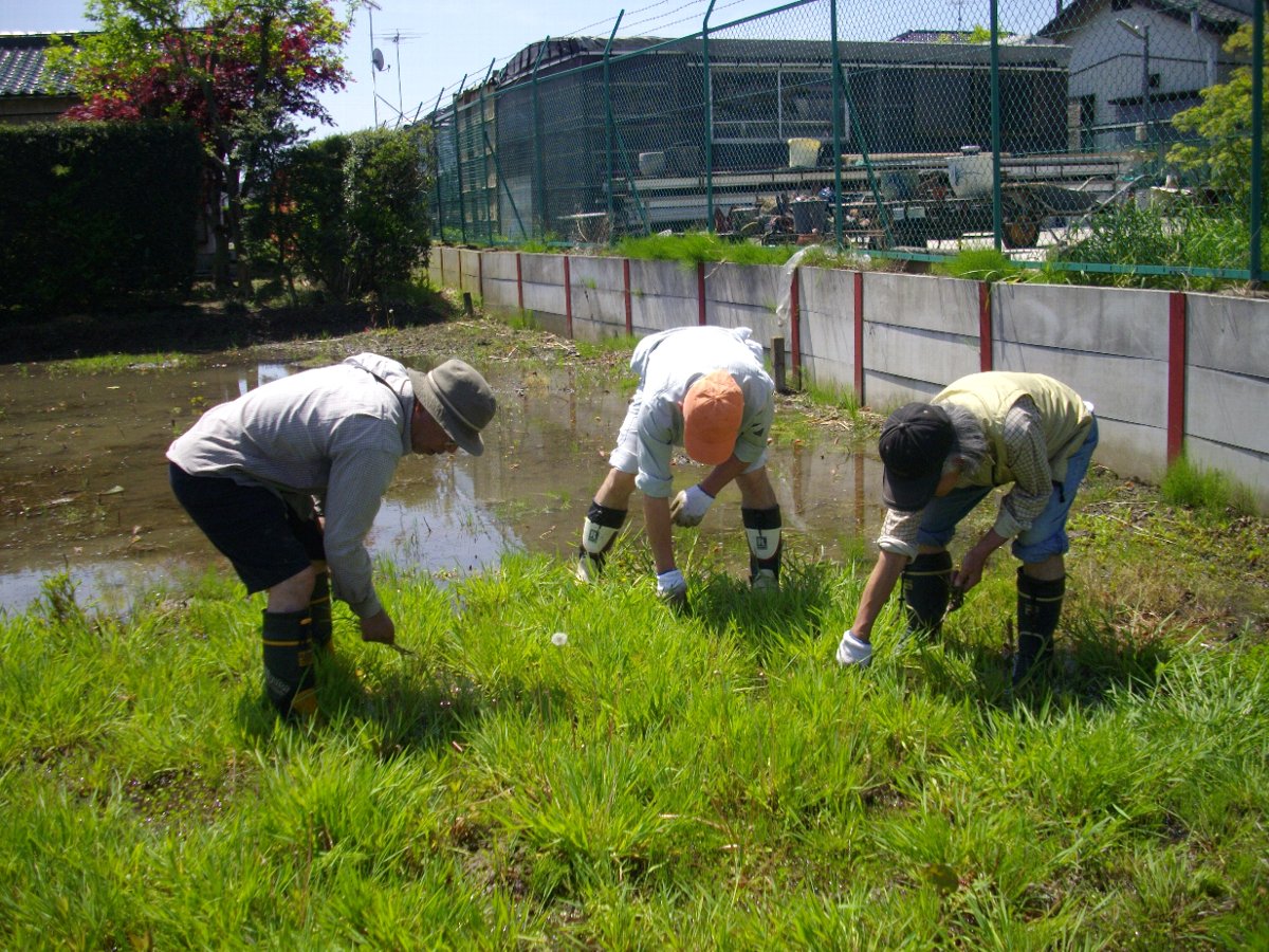 | 慣れない手つきで田植 | 草取り |