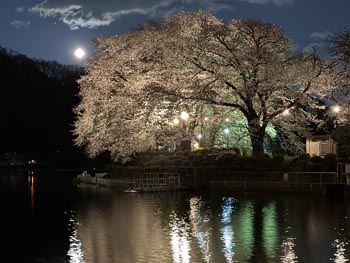 満開の桜と満月をパチリ! 4月2日(木) 雨が上がりやや強い西風が吹きましたが、少し花びらが散ったもののまだ満開の桜が楽しめます。新入生でしょうか、ランドセルを背負って写真を撮る家族連れなどが見られました。この日は満月、夜はライトアップされた桜と満月を楽しめました。