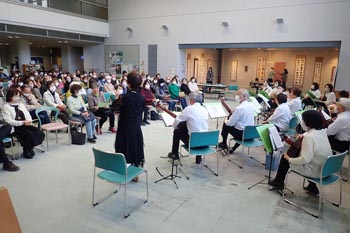 笠懸公民館利用者の会が主催する第134回のいこいの広場が2月28日に笠懸公民館のロビーで開催され、マンドリンクラブ「ボニータ」の演奏に130人ほどの観客が集まり、ロビーは立ち見客が出るほどの盛況となりました。