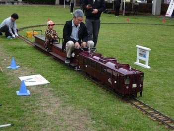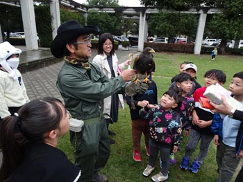 | 小雨のなか運行したミニトレイン。 | 身近に見るタカに興味津々。 |