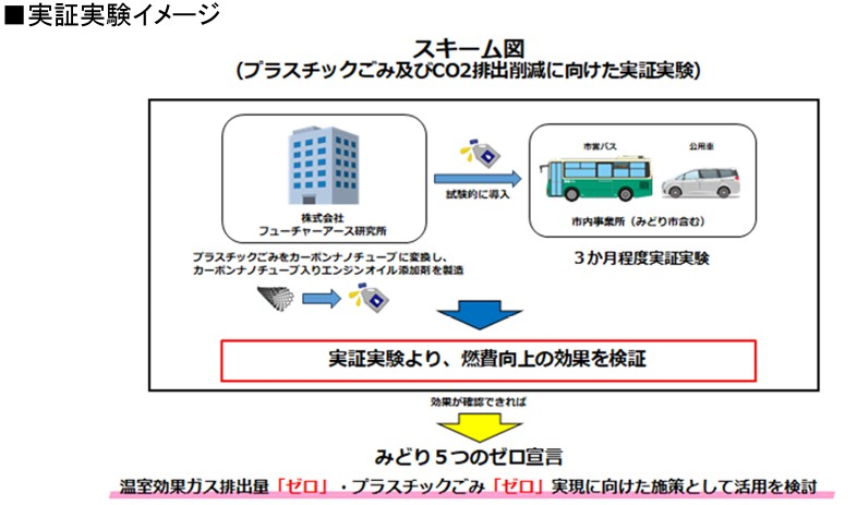 みどり市は、株式会社フューチャーアース研究所(東京都東村山市)が製造・販売する廃プラスチックから生成するカーボンナノチューブ(CNT)配合のエンジンオイル添加剤を試験的に市営バスや公用車に導入し、燃費向上率や温室効果ガス排出削減効果について実証実験を行うことを11月28日(金)に行われた記者会見で発表しました。
