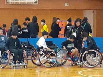 アリーナでは、お揃いのジャージを着た学生たちが車いすに乗り、バスケットボール体験コーナーで講師の塚本京子さん(パラリンピックの6大会に出場)の指導を受けていました。サブアリーナでは、健康チェックが主な催しで、スタッフは保健師さんや生命保険関係者などほとんどが女性でした。来場者も女性が多くみられ、「実年齢と検査結果年齢に差がない」と喜ぶ声や、「血管年齢が高い」と嘆く声が聞こえていました。
