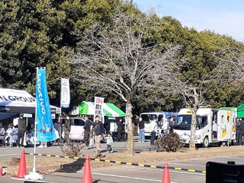 アリーナ南側駐車場のキッチンカーの並ぶ飲食ブースでは、晩秋の野外での食事を楽しんでいるよういすも見られました。両毛線南側の屋外エリアは、スタッフは男性が多く、「今日は、晴天で良かったです。各社のEV車が観られることはないですよ」と、来場者も男性が目立ちました。各社の自慢の高級車(最新技術で環境に配慮された)が展示された贅沢な会場でした。