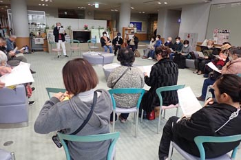 利用者懇談会は大掃除終了後にロビーで行われ、30人ほどがソファーで輪になって、「仲間を増やそう」をテーマに話し合いが行われました。