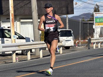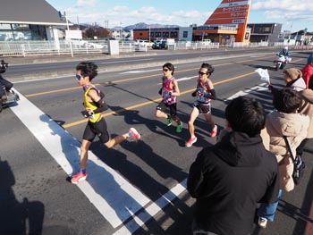 | 恒例のニューイヤー駅伝。GMOの選手が1位でみどり市を通過し、そのまま初優勝を獲得(笠懸町鹿付近) | 2位グループの3選手。ロジスティードの選手が先頭を守り2位でゴール(笠懸町阿左美付近) |