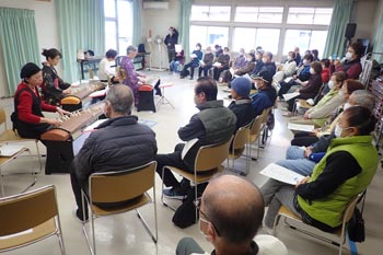 高齢者の健康維持や交流を目的としたみどり市笠懸町3区の「わかばサロン」が1月8日(木)、同区公民館で開催されました。年初のわかばサロンは、琴サークル「なでしこ」の皆さんが演奏する琴の演奏で新年らしい幕開けとなりました。