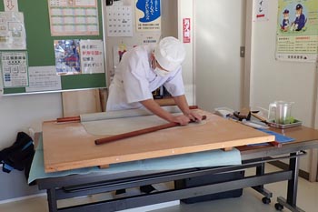 | 蕎麦打ち自慢の人たちが土産用の蕎麦を手打ち。 |