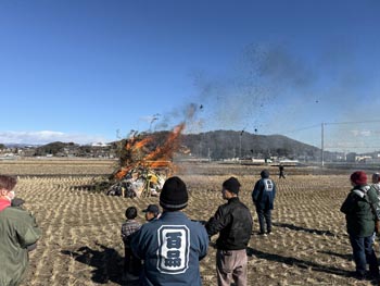 みどり市笠懸町鹿にある百品神社のどんど焼きが1月12日(月)午前10時から、神社西の“大田んぼ”で行われました。11日に実施を予定していましたが西風が強く、消防署から林野火災警報が出されたことも伝えられ、翌日に変更して行われました。