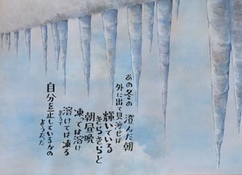 聖生さんの感動的な講話を聞き終えて、作者の思いを想像しながら再度作品を見て回ると、より印象深く見ることができました。私事ながら、怪我で野球を続けられなかった孫が中学生の時に描いた「初めて買ったグローブ」という詩画を思い出して、感慨に浸りました。