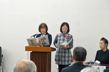 | エンジェルベルの活動について話をする渡辺さん。 | 詩の朗読を混ぜながら話をする大渕さんと新井さん。 |