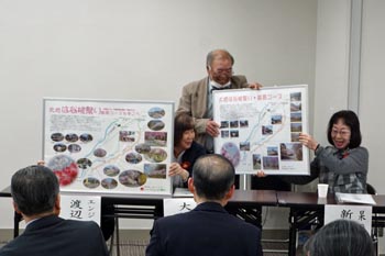 前半の活動発表では、ハンドベル演奏を行う「エンジェルベル」の渡辺好恵さん、星野富弘作品の朗読を行う「杲(ひので)の会」の大渕登喜子さん、新井恵子さん、花桃街道整備を行う「大畑しだれ桃の会」の山口雅道さんがそれぞれの団体の活動のようすなどを発表しました。「エンジェルベル」の渡辺さんは、「ベルの優しい音がみんなを優しい気持ちにしてくれる」と話し、仲間がいることの喜びを話しました。「杲の会」の大渕さんと新井さんは、星野富弘さんの命をいとおしむ気持ちを伝えることにやりがいを感じていることなどを話しました。「大畑しだれ桃の会」の山口さんは、活動が1本の苗木から始まったことや草刈りなどの作業は会員が自主的に行っていることなどを話しました。会場からは、花桃街道の取り組みが1本の苗木から始まったことに驚きの声が聞かれたり、長く続けることの秘訣に関する質問などが出されていました。