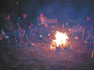 ![]() 焚き火を囲んで談笑 左から さいきさん、石井パパ、MAESTROさん、ピー助さん |