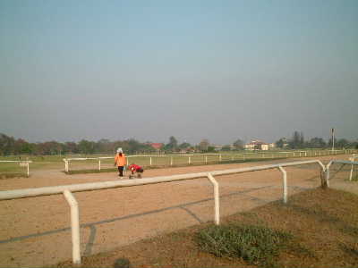 ユニークなゴルフ場で、競馬場に隣接しているために、競馬場をコースが横切ったりする。調教中の馬がいたりしてのどかなもんです。
