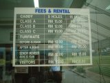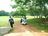 今日は日曜日だったので、グリーンフィーは150リンギット(約4500円)と結構高い。平日(75リンギット)の倍なのだ。キャディを頼むとあと30リンギット払うことになる。料金表を見ると、キャディフィーと並んで「TURFMATE15リンギット」などと書いてある。TURFMATEという言葉は初耳だ。フィリピンなどのボールボーイ(ボールをセットしてくれる少年)のようなものだろうかと想像したが、全くの見当違い。TUFMATEというのは、電動カートのことなのだ。電動カートといっても日本のカートとは全然違う。表現するのが難しい。ジェットスキーのゴルフ版という感じなのだ。人がカートの後ろに立って運転するのだ。こう言ってもわからないでしょうね。もう写真を見てください。多くのプレーヤーはこれを借りて自分で運転してプレーしている。フェアウェイの走行はOKのようで、このへんは羨ましい。日本もケチなことはいわないでカートでフェアウェイを走らせてもらいたいものだ。