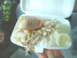 バスの中で食べるは「鳥肉のせご飯」の弁当だ(25バーツ、約75円)。ご飯に鶏肉をのせただけのものなのだが、とっても美味い。ご飯が鶏肉の煮汁で炊かれているので味がついていてなかなかいける。