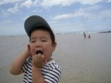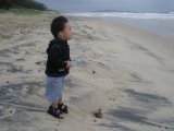 、波がくるのを待っている。お前も男らしく走り回れとけしかけたところ、走ったはいいが思いっきり前のめりに転んでしまい大泣き。ただ、もう海を怖がっていやがるかと思ったらすぐに復活して遊び始めたのは褒めてあげよう。