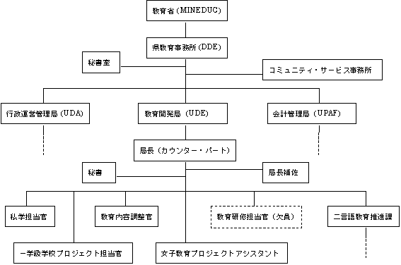 Verapaz/D.D.E.)が行う。教育省が教育政策およびカリキュラムを策定し、県事務所がその実施を担当している。県事務所はフォーマル教育(就学前、初等、中等前後)およびノン・フォーマル教育(特に識字教育と成人教育)を管理運営するが、必ずしもすべての教育行政分野を管轄しているわけではない。各省庁に属する各種学校はそれぞれ別に運営されている。 県内は16の市町村があるが、それとは別に30の学区に分けられ、行政技術調整官(Coordinador Tecnico Administrativo/C.T.A.)がそれぞれの運営にあたっている。現在アルタ・ベラパス県の学校数は635校、教師数は2641人(2000-01現在)。これらの管理を27人のCTAで行っている。 行政技術調整官の任務は以下の通り。 @ 管轄学区内の活動展開また、教育事務所内は以下の部局に分けられている。 @ 行政管理運営局(Unidad de Desarrollo Administrativo/UDA)私が配属されているのは、アルタ・ベラパス県教育事務所内の一部局である教育開発局であり、カウンターパートもここの責任者である。 |
