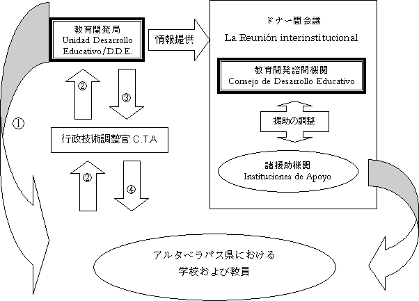 | しばらくは先輩隊員とともに学校を訪ね歩いたが、さしたる目的もなく学校視察を続けてもしかたがないため、再びオフィスに戻り、ドナー間会議の準備に取りかかった。ようやく教育開発局の秘書が休暇を終え、事務所に復帰したため、具体的な業務の話ができるようになったこともある。といってもとりあえずは、秘書に渡されたこれまでの会議の議事録などを読む必要があり、書類を読み続ける毎日に変わりはなかった。 この間、秘書をのぞき、あいかわらず事務所側からの働きかけはない。赴任してまもなくカウンターパートに業務計画を提出しても、ほとんど読みもせず綴りのチェックだけされて返却されてしまう。スペイン語があまり話せないため、相手にされていないのだろうと感じた。独立したパーテーションに机があることもあり、事務所内で会話がほとんどないのでスペイン語の会話能力が今後上達するとも思えず、精神的にかなりのストレスを感じていたのもこの時期である。もう一人の先輩隊員が任国外研修から帰国し、同じ事務所内に先輩隊員が2人もいるようになったことが救いであった。 過去の議事録や企画書により会議の概要は把握することはできたが、実際問題として、どのように調整業務を進めればいいのかがつかめず、議題を提案するまでにはなかなか至らなかった。悩んでいるところに先輩隊員からの示唆を受け、各学校の現状についての情報を各援助機関に提供することによって、調整業務を円滑に進められることに考えがおよんだ。 この段階で深く危惧していたのは、援助の調整がうまくいかず、会議の存続が難しくなる可能性があったことである。というのは、会議の機構がさほどうまく機能していないことをうかがわせる報告書があがっていたためである。 前任者が設定した会議の機構は、定例会議の前に分野別の委員会会議と執行部会議を行うというものであったが、今回、3分野ある委員会会議のうち、実施されたのは教員研修部門一つのみであり、結論として有意義な会議ではなかったと位置づけられている。これは教育事務所の調整がなく、いまだ援助の重複が解決されていないためである。援助の重複を避けるためには、各援助機関による活動内容をしっかり把握し、それをもとにそれぞれの活動を調整する必要があるが、強制力を持たない教育事務所としては各援助機関に報告書の提出を義務づけることが非常に難しく、したがって各援助機関の活動を把握しきれないのである。 これらの現状をふまえ、会議に先立ってカウンターパートである教育開発部長に提案したのは、事務所独自の情報網を作り上げることである。各学校の現状を把握し、その情報を各援助機関に伝えることによって、援助の重複やかたよりをなくことができる。また、これらの情報を教育事務所が提供することによって、会議の主導権を握ることも可能となる。 グァテマラにおいては本来、行政技術調整官(Coordinador Tecnico Administrativo/C.T.A.)が各学校の現状を把握しているはずなのであるが、必ずしもすべての学校の状況を的確につかんでいるわけではない。というのは、グァテマラの集落の特徴として、各コミュニティが広い地域に散在し、それぞれのコミュニティにある学校をすべて巡回するのに非常に時間がかかってしまうためである。必要な情報が行き届かないこともしばしばある。電話が存在しないのはもちろんである。 実際、先輩隊員が前述の図画工作および理科教材展の作品募集のために県内各地を巡回したときにも、多くの学校が行政技術調整官からの情報を得ていないことがわかっている。これまでもこうした状況を改善する試みがなされてきたが、いずれも根本的な解決には至っていない。 今回提案したのはCTAによる情報網というよりも、各学校と教育事務所との直接的な連絡を可能にしようとするものである。つまり、学校向けの「教育事務所通信」の発行によって教育事務所からの業務連絡を徹底するとともに、その配布・取材を通じて各学校の各学校の現状と援助要請の状況を拾い上げ、把握した情報を各援助機関に向けてドナー間会議(アルタベラパス県教育開発諮問機関定例会議)で配布するというものである。 以下は月例CTA会議の際、プレゼンテーション資料として使用した概念図である。 |