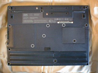 | 1.裏面のねじを、隠しネジを含めてすべてはずす。 中央4つの隠しネジ、中央右のメモリ・スロットのカバーネジも忘れずはずすこと。 |