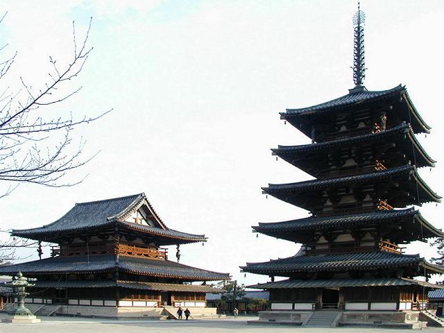 金堂と五重塔です。Photoshopで、建物の傾き(広角レンズのゆがみ)を補正しています。