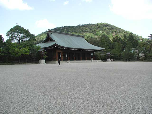 外拝殿です。後ろの山が、大和三山のひとつ、畝傍山(うねびやま)です。広々とした境内です。
