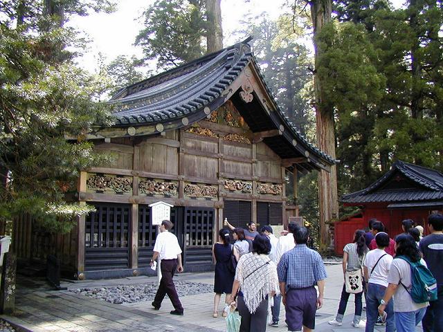 三猿がある馬舎です。左から2番目が三猿です。他にも猿の彫り物がたくさんあります。