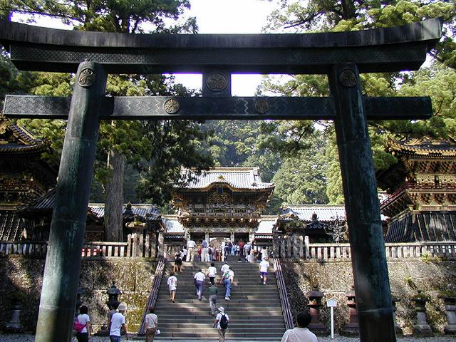 銅製の二の鳥居の奥に、陽明門が見えます。