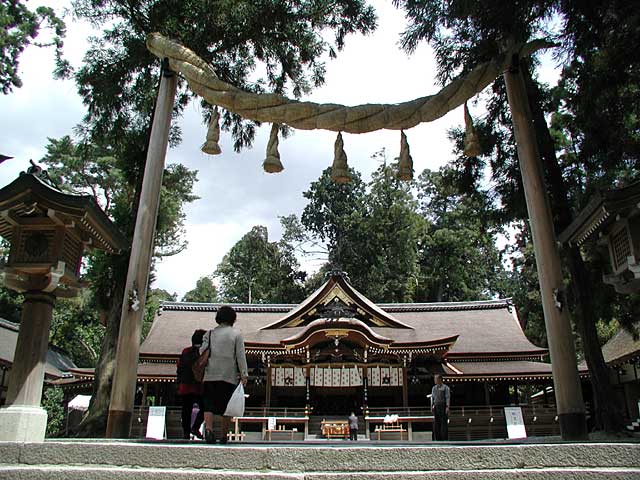 鳥居に注目です。2本の柱に、縄がかけてあるだけで、横の木がありません。