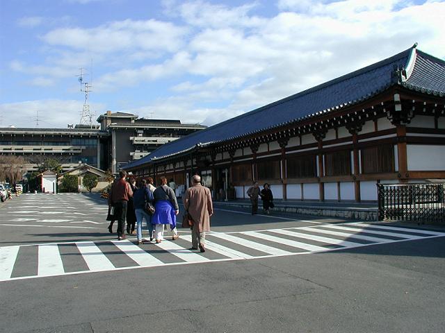 門を入ると、駐車場と回廊の入口があります。