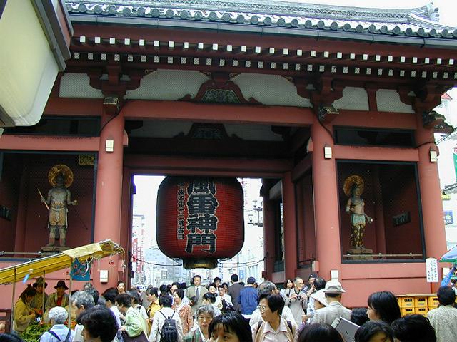 参拝を終えて、雷門を反対から見ています。風神と雷神が見えます。