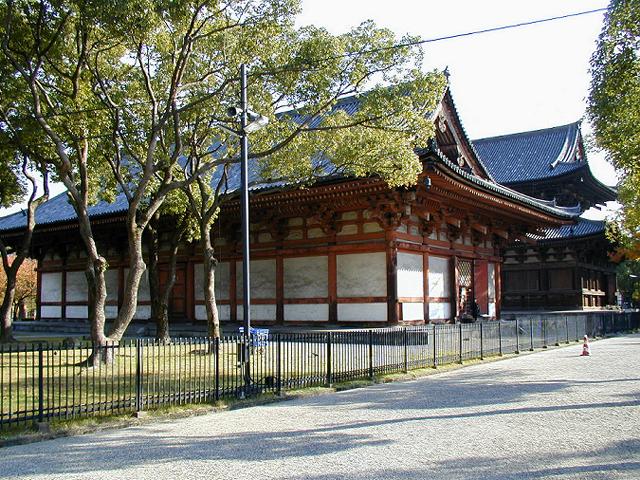 手前に見えるのが講堂です。密教仏像の宝庫です。奥が薬師三尊の金堂です。