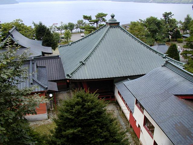 五大明王堂からの風景です。中央のお堂が観音堂です。前方は、中禅寺湖です。