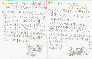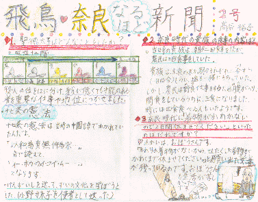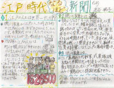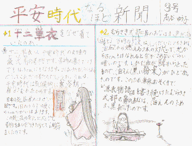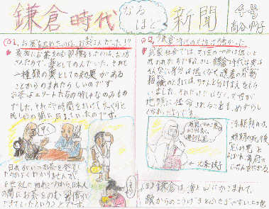 ・第4作目です。 ・天下の鎌倉時代です。 ・お茶の事や、当時の女性の地位について書いてみました。 ・調べる事から、仕上げまで初めて一人でやりました。やっと、資料を調べて新聞を作る作業になれてきました。 |