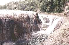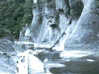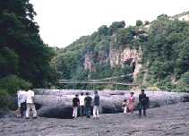 この滝は、幅30m・最大落差7mを誇り、昭和11年に天然記念物に指定されています。 写真では分かりにくいのですが、川の中央部には流れに沿った深い溝が走っており、その溝に向かって両側から 水が流れ落ち、滝を形成しています。 地元の人の話では、今年は水不足の影響から水が少なく迫力がないとの事で、今回歩いて上の写真を撮った辺 りは、普段は川の中だそうです。(水量が通常であれば展望台からの俯瞰をお薦めします。) この滝は、約900万年前の火山噴火の伴い発生した大火砕流が冷えて固まり、その後片品川の流れが岩を侵 食し形成されたものだそうです。 また、この辺り一帯を総称して「吹割峡谷」と言い、こちらもまた名勝に指定されています。 ここには、遊歩道に沿って吊り橋や展望台があり散策を楽しむ事が出来ます。 |
