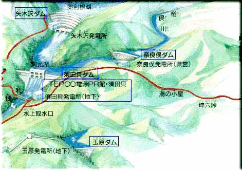 ドライブルートのコマ地図6番を矢木沢ダム方面へ向かい、3分位走ると右側に見える巨大な発電