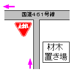 材木置き場の先、T字路突き当たりを左折し、国道461号線を東へ向かう。
