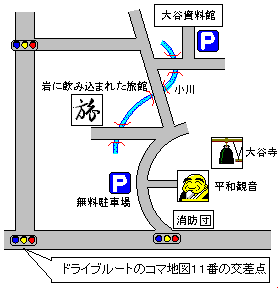 岩に飲込まれた旅館へのアクセス ドライブルートのコマ地図11番の付近、平和観音から大谷資料館へ向かう途 中の、交差点を左折すると、右側にあります。 案内図