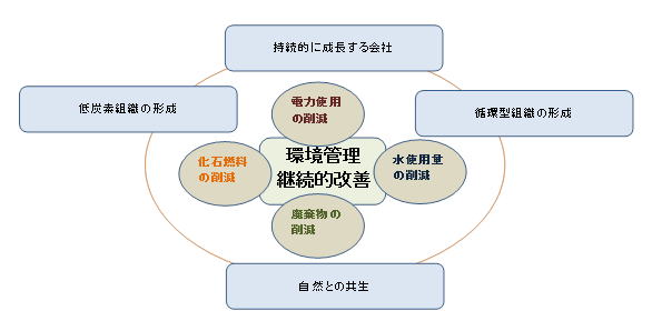 1.低炭素組織の形成に努めている事業所 a)電力使用量の削減 b)化石燃料使用量の削減 c)太陽光・太陽熱の利用の取組 2.循環型組織の形成に努めている事業所 a)廃棄物の3Rの取組 b)用水の再利用の取組 3.自然との共生に努めている事業所 a)植樹への取組 b)里山再生事業への参画等 4.継続的に成長する会社を目指している組織 a)SDGsへの取組 b)ISO14001、エコアクション21への取組 |