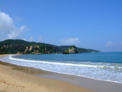 西表サンクチュアリーリゾート ニラカナイの目の前に広がる三日月状の浜。巨大な岩が海の中からそびえ立つ独特な景観が印象的。ビーチの砂は非常に細かく、波打ち際を裸足で歩くとめっちゃ気持ちがいい。2008.5.30(金)10:45晴れ時々曇り。波が高い。サーファー数人。