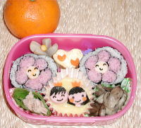 まさに「血と涙の結晶」のお弁当です(T0T)作りながら「痛っ!」「うっ!」「くぅ〜」っと何度うめき声をあげたことか。ばっさり切った親指をさすりつつおやゆび姫のお弁当を作る私・・・執念ですっ!!!ノリはどうにか自力で切りました。絵本のイラストを自分なりに改造して切りやすいようにシンプルな形に。中指と人差し指でハサミを動かして切ったのでちょっとイビツになりましたが(^▽^;)ソーセージは親指姫がツバメを看病したときにつかった薬のビンをかたどってあります。このお弁当のデザインはe-obento.comのちびぶーさんのお弁当を参考にさせていただきました。 ★おやゆび姫ランチ-4★ ・ナポリタン(タマネギ、トマト缶、大根葉、レンコン、ブロッコリーの茎) ・玉子焼き ・ほうれん草とコーンのバター炒め ・ゆでソーセージ ・人参 ・レタス ・トリのから揚げ ・柿 |