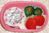 今日はちょっとマニアなキャラ弁。「カードチャプターさくら」というNHK教育で放送しているアニメに出てくるケロちゃんを作ってみました。この番組、なぜNHKなのかよくわからないけど子供向けなのにオタク系のお兄様方が好きなのよね(^▽^;)ちょっと微妙なアニメなわけ。週末時々お嬢が見ているので今日は作ってみました♪グラタンの上のあやしい物体はさくらちゃんが持つスティック。久々にのり芸してみました(^^)v 今日はパパのお弁当もお絵かきしてるんでよかったら見てね(^_-)☆パパのはMr.インクレディブル弁当で〜す! ★ケロちゃんランチ★ ・焼き豆腐のピカタ ・手作りチキンナゲット ・人参のグラッセ ・ほうれん草とコーンのバター炒め ・カレーポテトグラタン ・伊予柑 ・卵の黄身焼き ・のり ・いなり皮 |